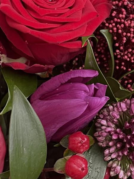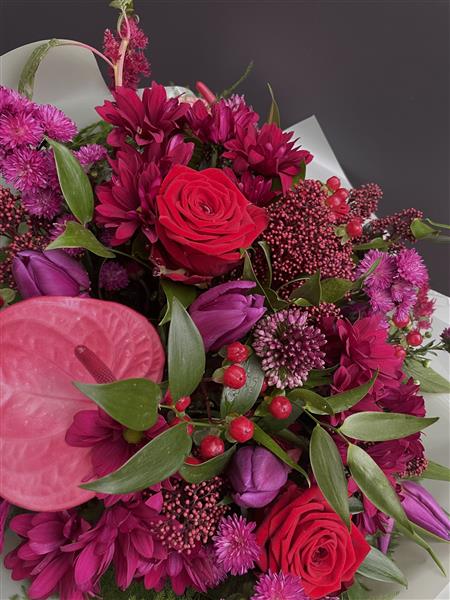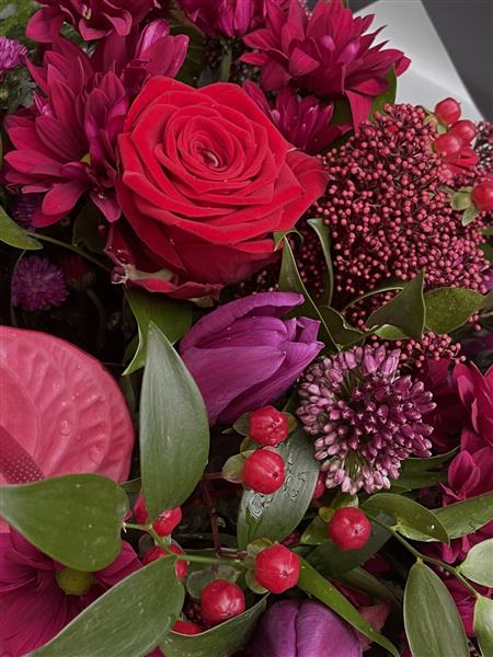 Burgundy Love: A rich and warm composition that radiates depth and elegance. This luxurious bouquet feature velvety roses, plush chrysanthemums, and striking anthuriums, creating a bold interplay of texture and colour. accented with stunning seasonal blooms and foliage, this is perfect for making a dramatic, heartfelt statement, an anniversary, birthday celebrations or just simply to brighten someones day.