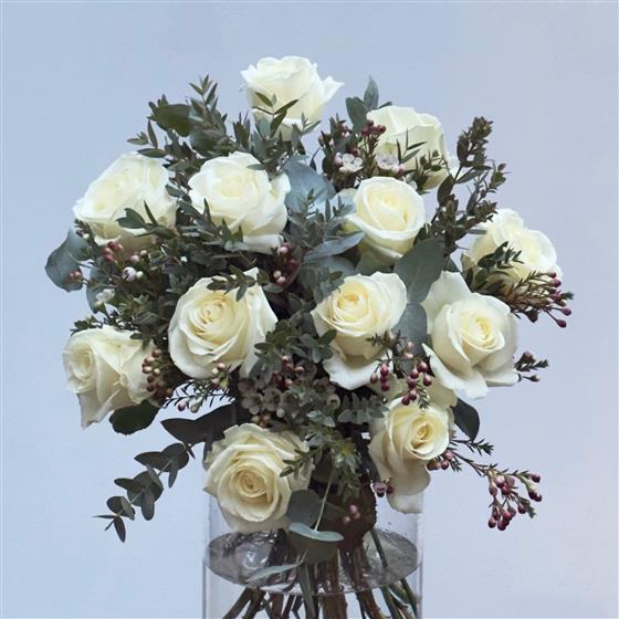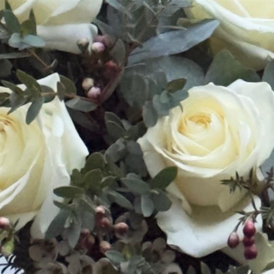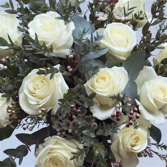 Pure Love: A stunning selection of the dreamiest white roses. Perfectly placed and surround by an array of gorgeous scented seasonal foliages. A timeless bouquet that oozes elegance.