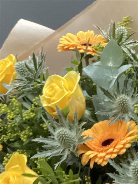 Sunny Splendor: A radiant yellow bouquet of fresh Roses and cheerful Gerbera daisies. Bright, joyful, and perfect for celebrations, gifts, or adding a splash of sunshine to any space.