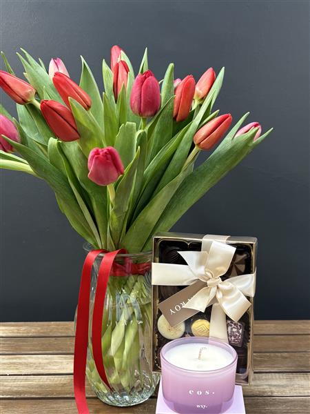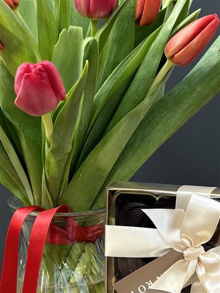 Show your love with Sweet Romance, a delightful vase arrangement that captures the joy and tenderness of Valentine's Day. Featuring a mix of red and pink tulips. Combined with our luxurious Van Roy Belgian chocolates, a truly heartfelt gift.